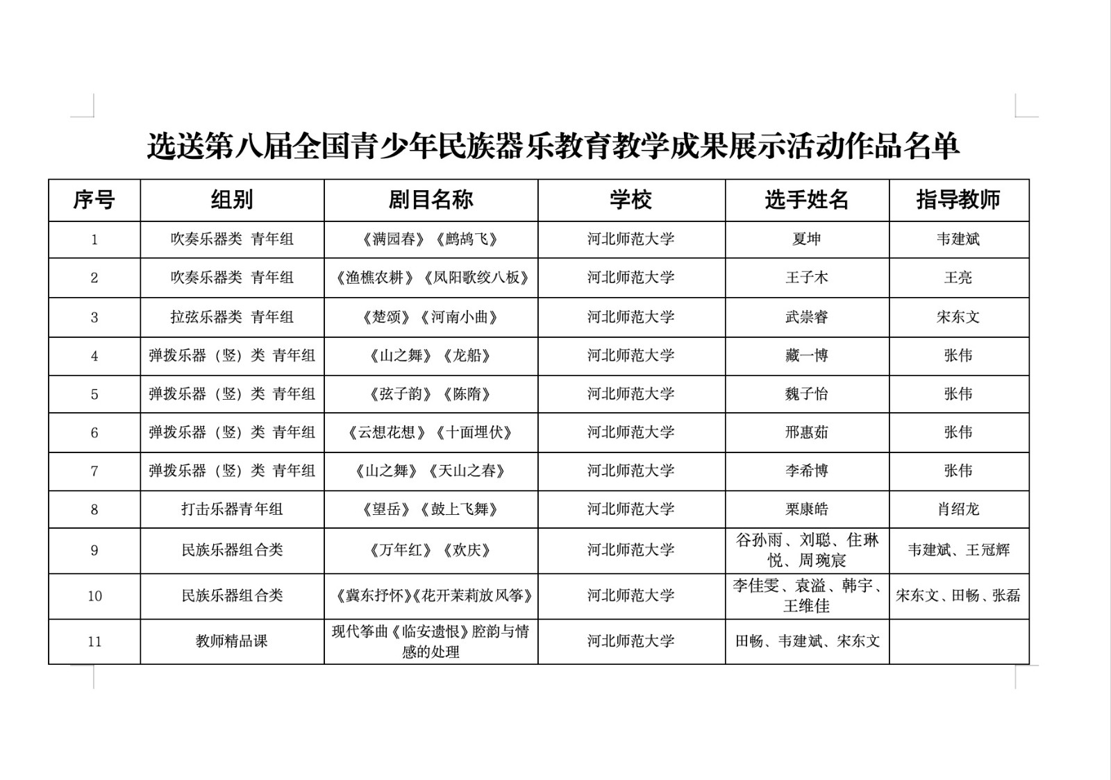 自活动启动以来,我校高度重视,澳门正规电子游戏平台认真组织,参赛师生反复打磨,精心备赛。经过激烈角逐,我校师生共获得一等奖、二等奖、三等奖各6项。河北师范大学获优秀组织单位荣誉称号。其中,吹奏乐器类《满园春》、拉弦乐器类《楚颂》、弹拨乐器类《山之舞》、打击乐器《望岳》、民族乐器组合类《万年红》以及教师精品课《现代筝曲<临安遗恨>腔韵与情感的处理》等11项作品将代表河北省参加第八届全国青少年民族器乐教育教学成果展示活动。