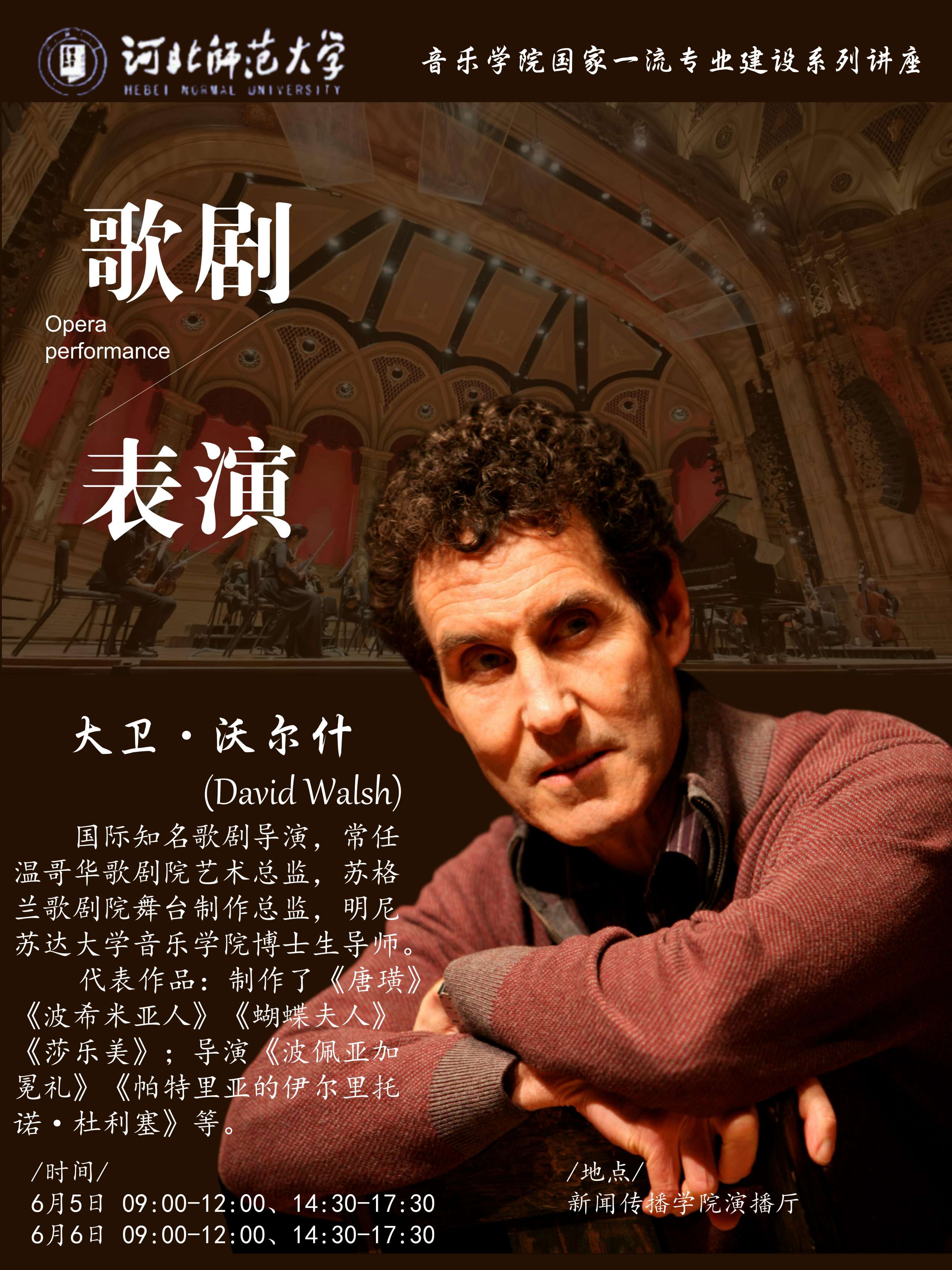 大卫·沃尔什 (David Walsh) ,国际知名歌剧导演,常任温哥华歌剧院艺术总监,苏格兰歌剧院舞台制作总监,明尼苏达大学澳门正规电子游戏平台博士生导师。作为国际歌剧舞台导演,大卫·沃尔什长期活跃在德国、英国、美国、加拿大、荷兰等国际知名歌剧院及大学工作。大卫·沃尔什先生是英国皇家歌剧院(考文特花园)、英国国家歌剧院、巴黎歌剧院、里昂歌剧院、圣达菲歌剧院、法兰克福歌剧院、德意志莱茵歌剧院、荷兰歌剧院、布鲁塞尔歌剧院、加拿大歌剧院、苏格兰歌剧院等五十余所知名歌剧院签约导演,至今为止执导与创编制作两百余部歌剧。