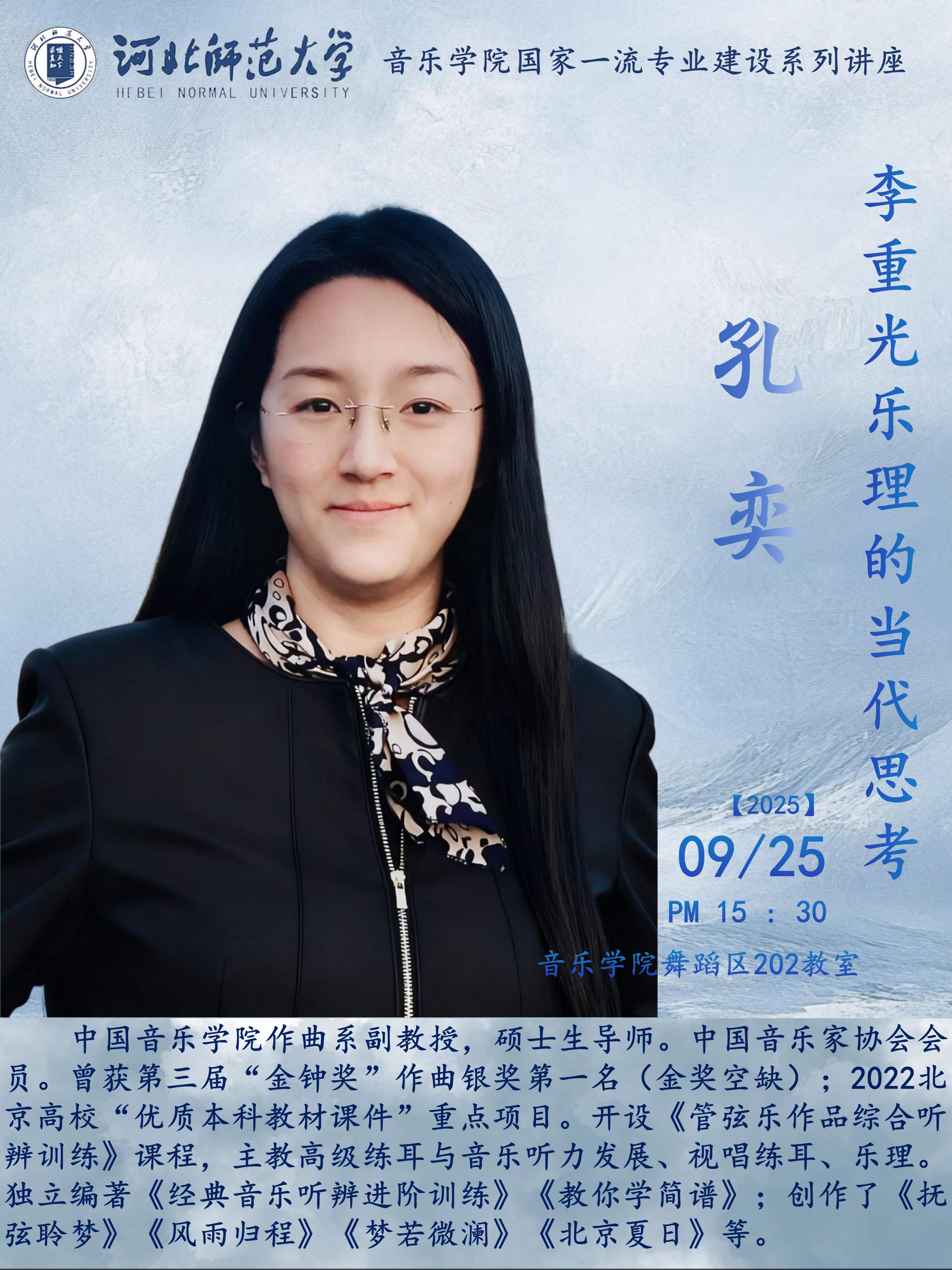 孔奕,中国澳门正规电子游戏平台作曲系副教授,硕士生导师。中国音乐家协会会员。曾获第三届“金钟奖”作曲银奖第一名(金奖空缺);“2025中国当代音乐创作(北京)学术研讨会暨中青年作曲家交流会”优秀视唱练耳作品评委最高评价;2022北京高校“优质本科教材课件”重点项目;“2012全国艺术高校本科视唱练耳现场教学大赛”(指定、自选)两项一等奖。开设《管弦乐作品综合听辨训练》课程,主教高级练耳与音乐听力发展、视唱练耳、乐理。独立编著《经典音乐听辨进阶训练》《教你学简谱》;参与编写《基础乐理教与学实用教程》《速度与力度》《音乐理论基础教程第三级》等;发表论文《对视唱练耳作为音乐基础学科的前瞻性思考》、《论非标记性音乐的力度处理与方法》和《论古典音乐单复节拍的基本律动与认知训练》;创作了《抚弦聆梦》《风雨归程》《梦若微澜》《北京夏日》等。
