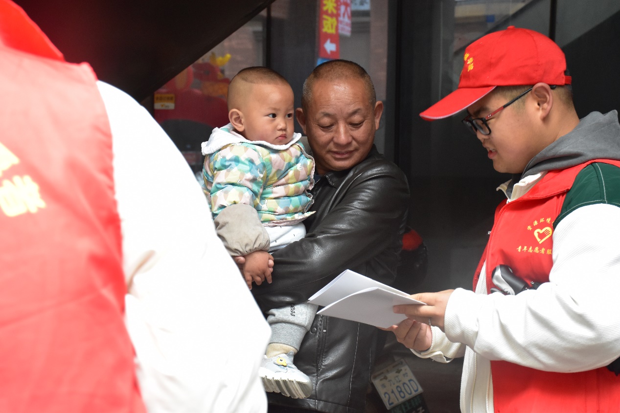 入党积极分子们在社区内分发植树保护生态环境宣传手册,宣传生态环境的具体保护措施和植物对生态环境的重要性。