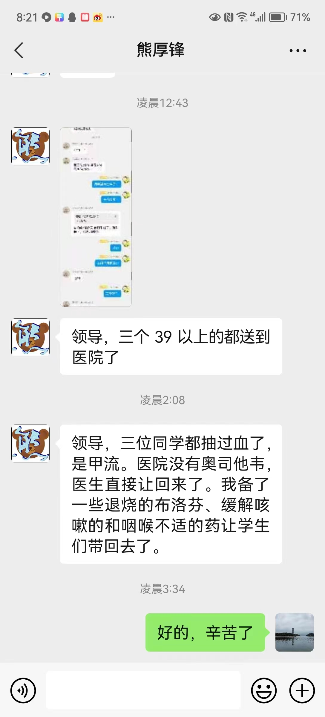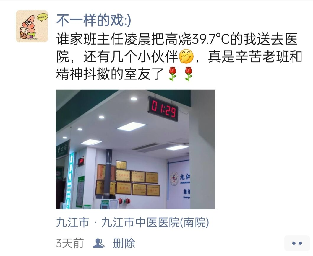 4月7日凌晨。一阵急促的手机铃声、短信将正在睡梦中的班主任熊厚锋惊醒,打来电话、发来信息的是熊厚锋老师所带班级的班干,发现班上有3名同学高烧39.7℃、39.3℃、39.2℃,一听有学生生病,熊厚锋老师赶紧穿上衣服跑了出去,紧急将发高烧的同学送去就医,并为其垫付医药费,直至凌晨3点才回,让学生十分感动。