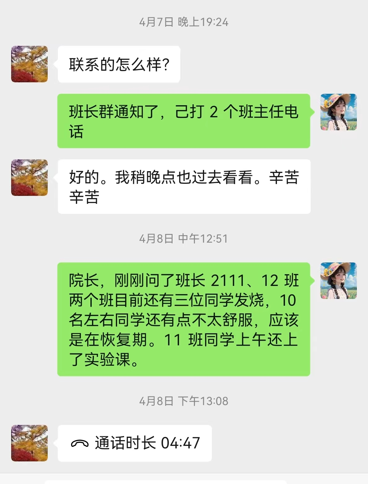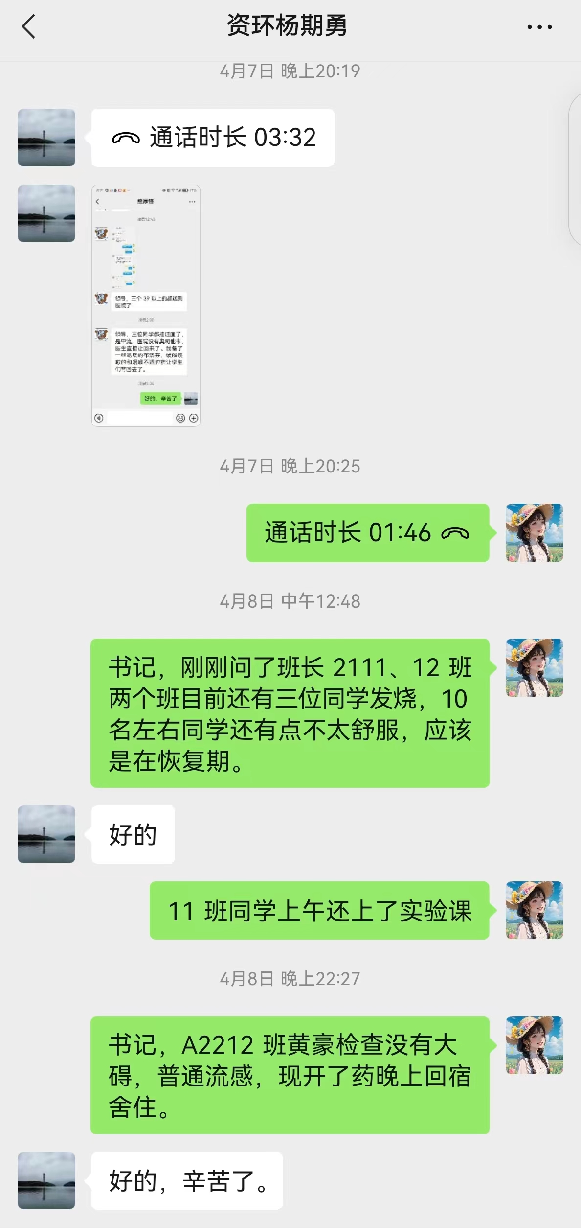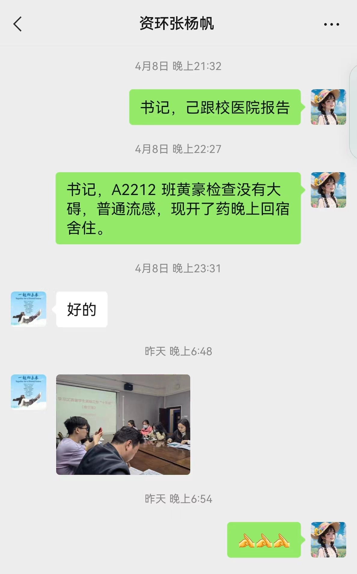 4月6日傍晚,beat365英国官方网站A2111、A2112、A2212班班主任熊厚锋、黄亮、李浩然三位班主任接到班干的电话报告发现班级多名同学有感冒发烧不舒服的症状,立即赶到宿舍看望学生,带学生就医,直至凌晨。
