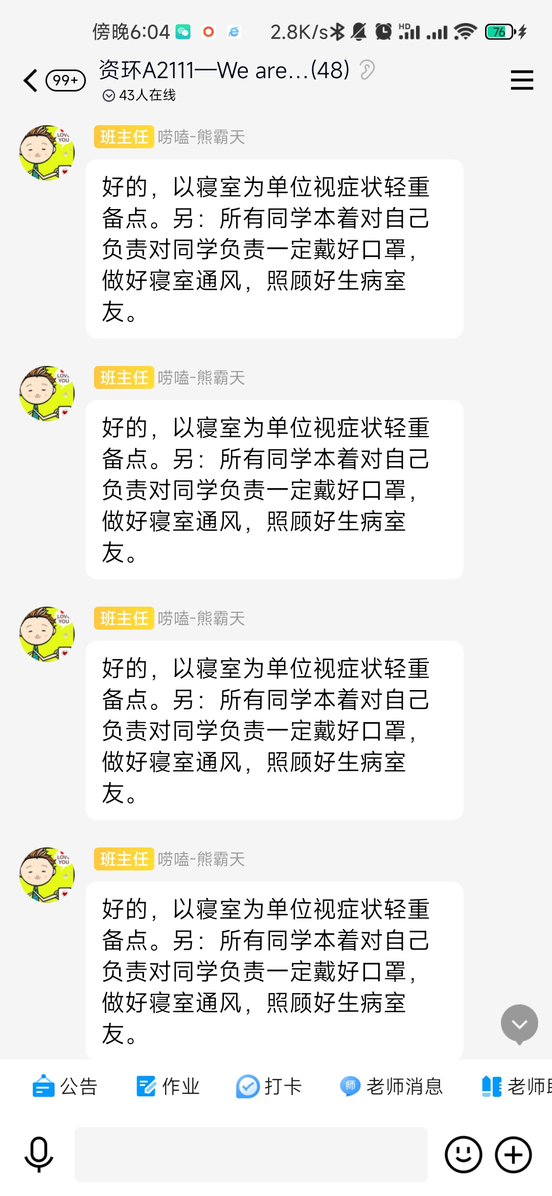 初春时节是流感等各种呼吸道疾病的高发时期,beat365英国官方网站班主任用责任、奉献书写了教育工作者爱校爱生的深情和担当。
