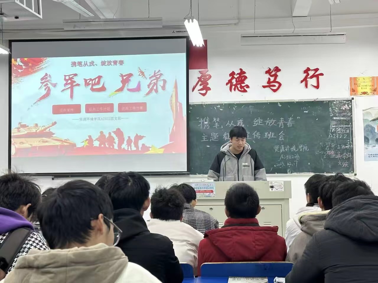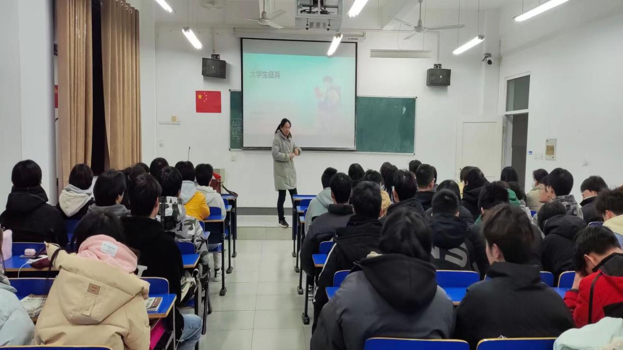 主题班会上,各班班委首先向同学们介绍了我国的征兵制度和征兵工作的重要性,强调了大学生参军对于国家和个人的重要意义。接着各班班主任介绍了大学毕业生应征入伍的条件、征兵工作的时间节点、应征入伍的优惠政策等方面的征兵知识,针对退伍士兵复学、升学、就业等方面的内容做了详细讲解,让同学们对于征兵有了更加全面和深入的了解。