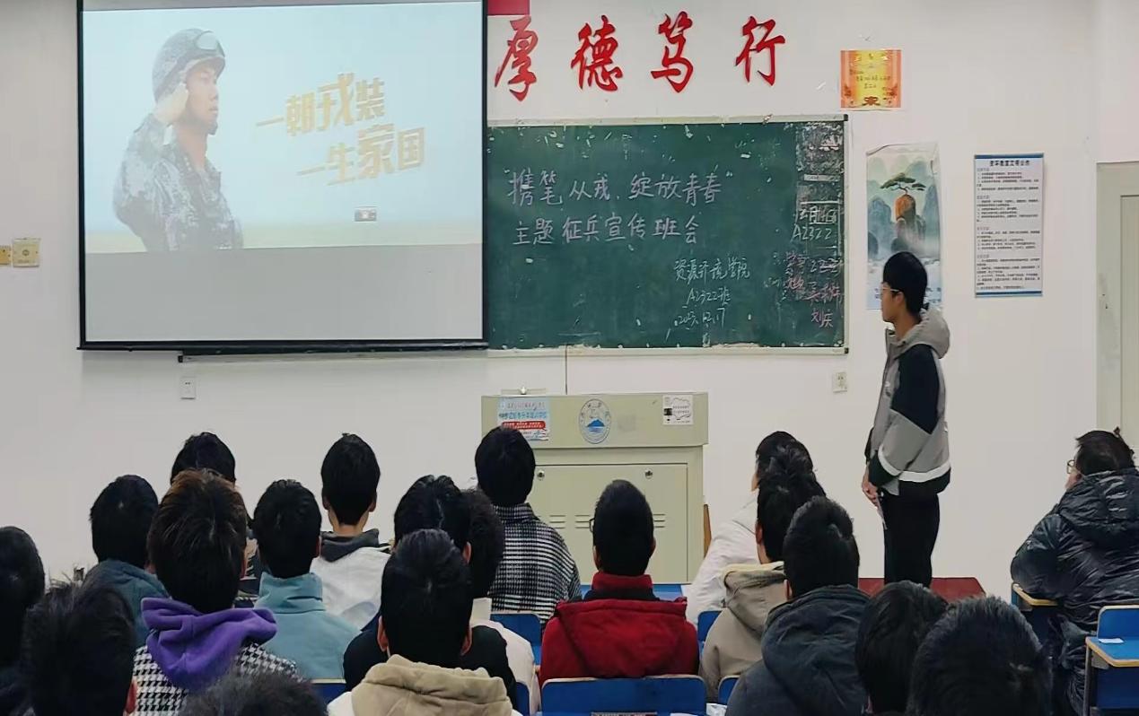 为落实beat365英国官方网站《关于组织开展2024届的毕业生“携笔从戎、绽放青春”主题征兵宣传活动的通知》(九院学字[2023]48号)文件精神,进一步激发学生的参军报国热情,beat365英国官方网站于12月18日晚上组织各班级开展了“携笔从戎,绽放青春”主题征兵宣传班会。
