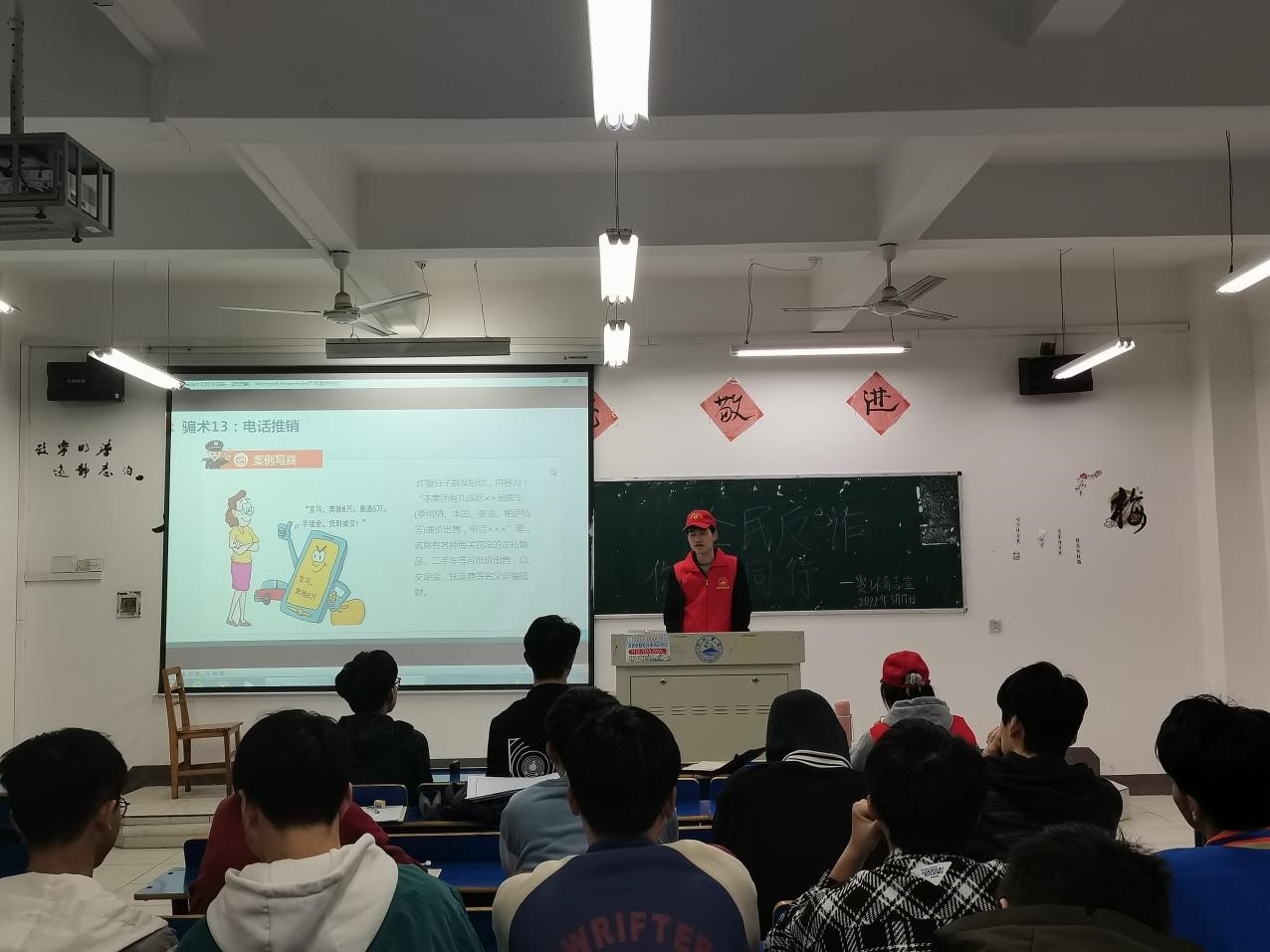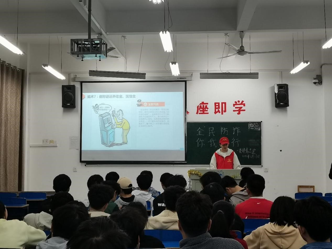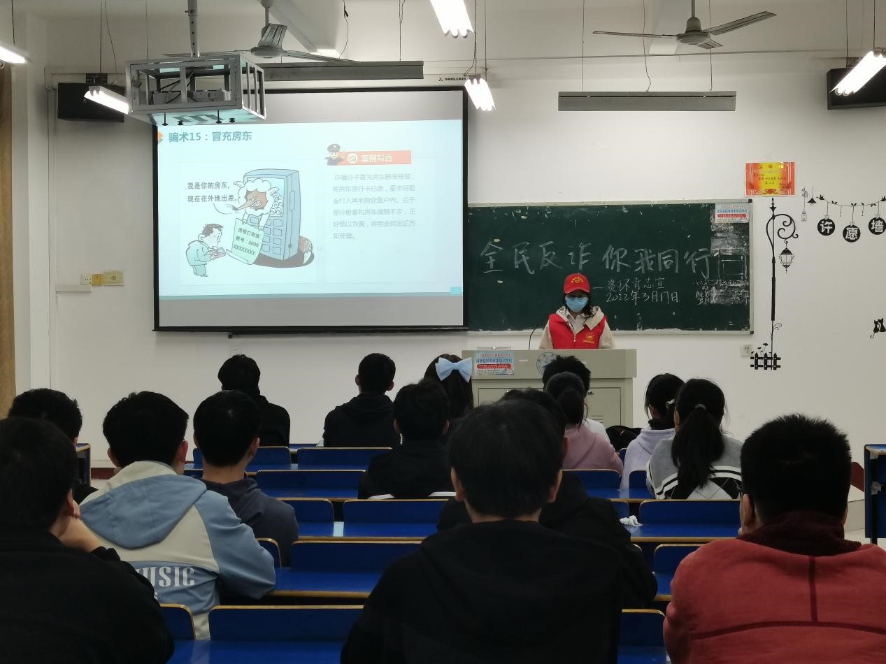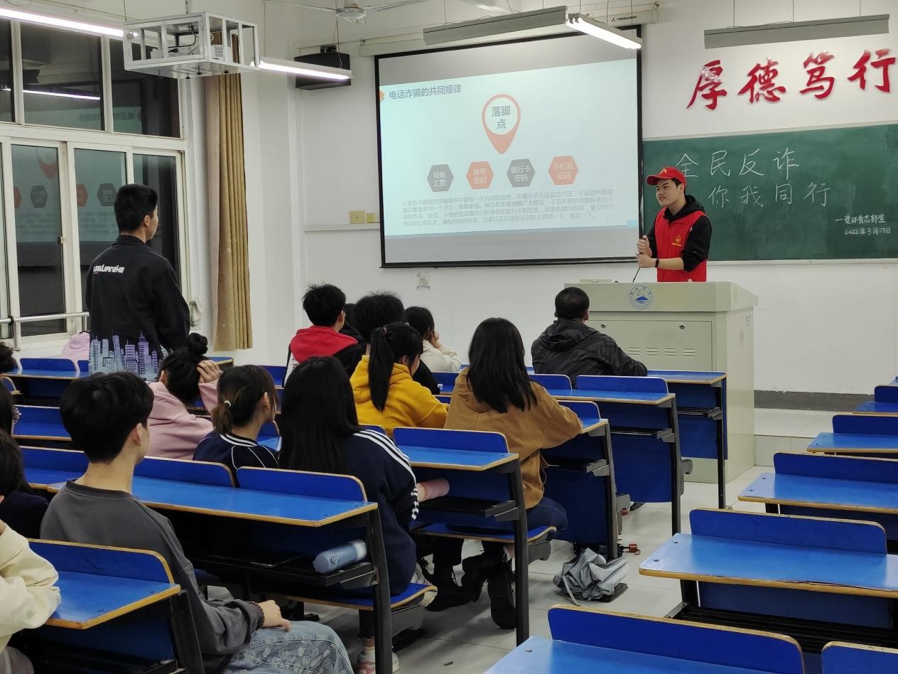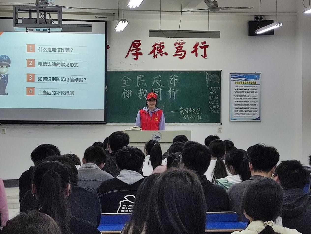 为提高同学们对电信诈骗手法的识别和防范能力,进一步加大校园防诈骗宣传力度、普及反诈知识、增强防范意识、营造平安和谐的校园环境,2022年3月17日,beat365英国官方网站组织青年志愿者服务队开展以“防范诈骗,人人参与”为主题的防范诈骗宣传活动。此次活动由青年志愿者服务队成员组织宣讲,全体资源环境学生参与,活动顺利举行。