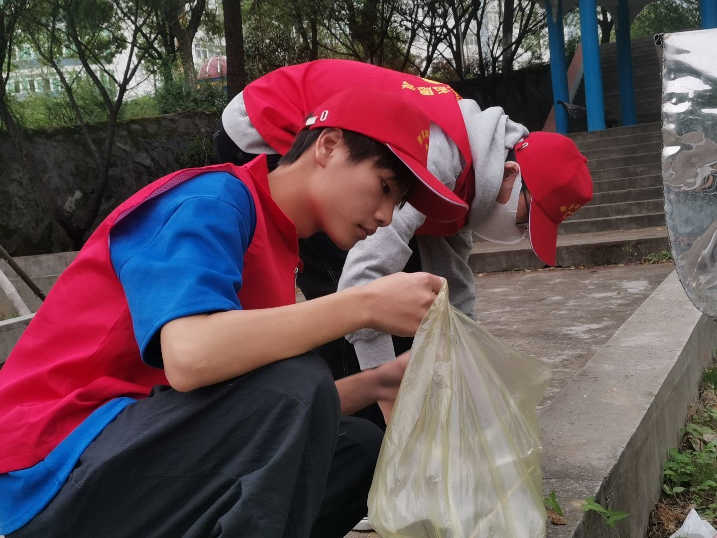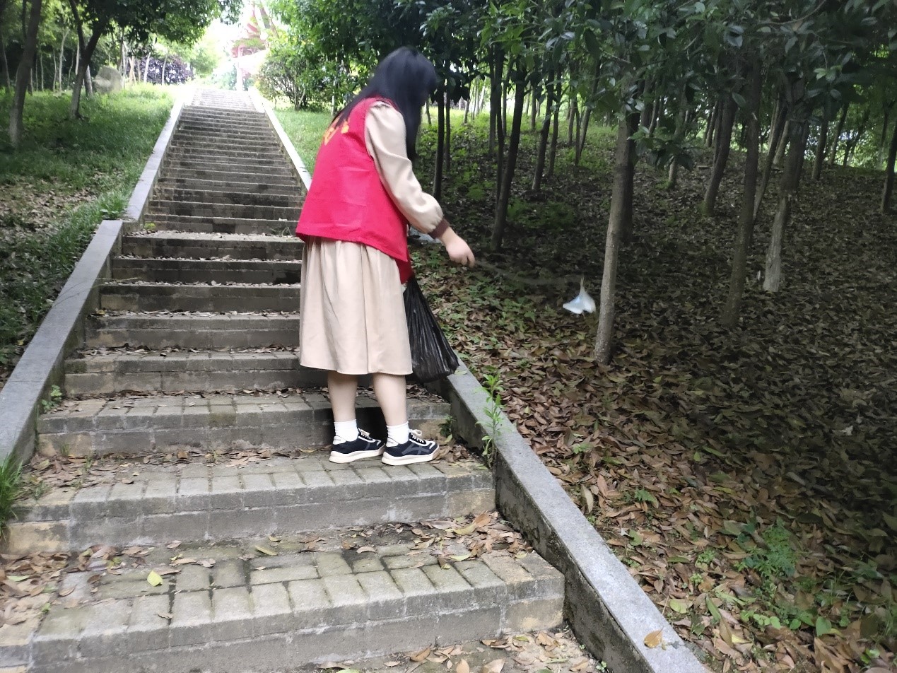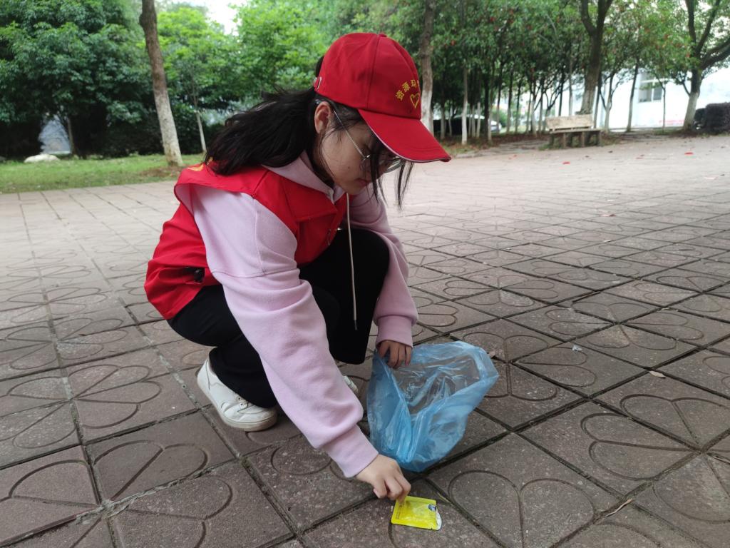 志愿者们自带垃圾袋到学校的各处清理垃圾,还学校一个文明美丽的环境,清理过程中志愿者展示阳光向上,精神饱满的良好状态。同时也向同学们传递“爱护环境,人人有责”的思想。
