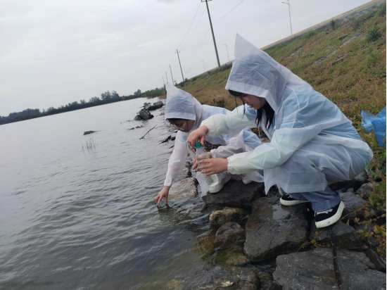 实践队员们沿产业园旁公路一路行进直至赤湖边,按既定分组捡拾散落在湖边的垃圾并统一进行分类。同时水质调研小队则以监测为重点用矿泉水瓶采集赤湖水样并贴好标签妥善保存,水样将带回学校进行检测分析。