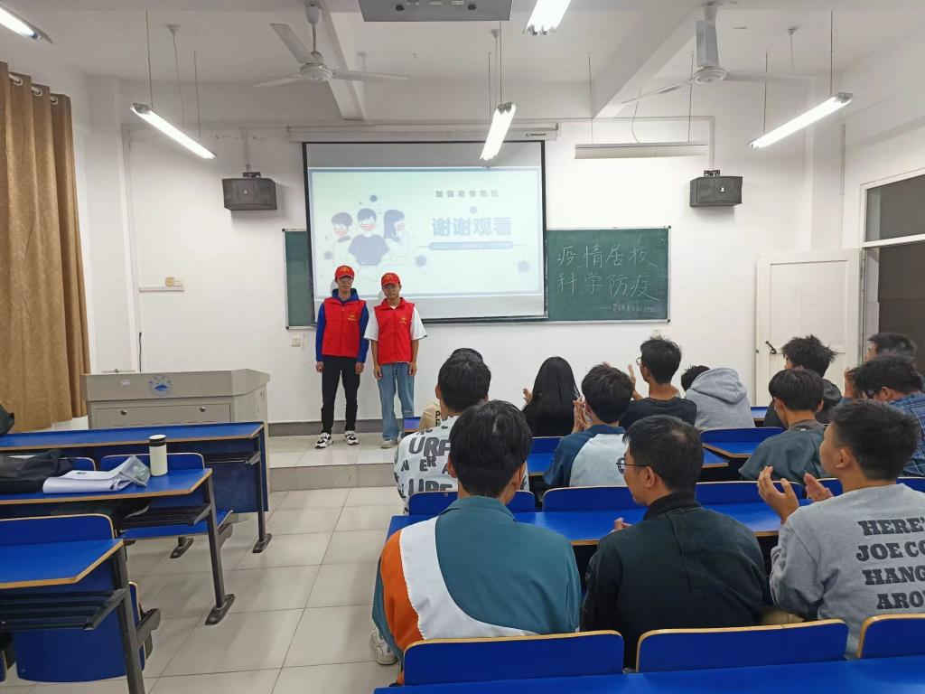 活动过程中,志愿者们分散到各个班级开展教育宣传,分别从理性认知、科学防护、心理调试、运动健身四个方面向同学们讲解“疫情居校,科学防疫”,积极教育引导学院学生放平心态、科学防疫,鼓励他们在大疫情背景下追寻光,成为光,散发光,收到了同学们的热烈反响与回应。