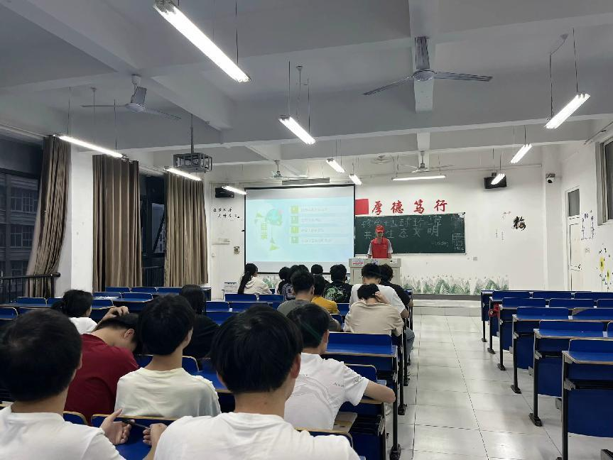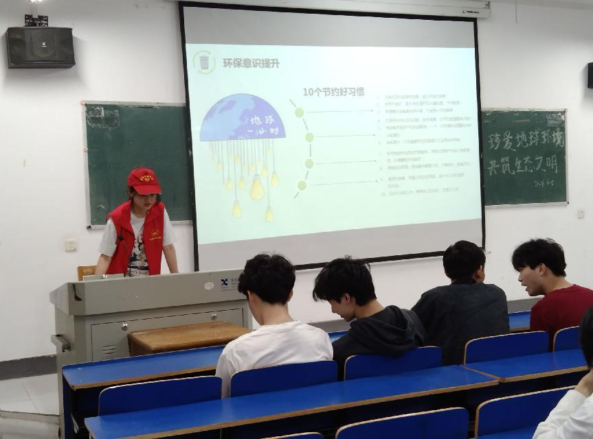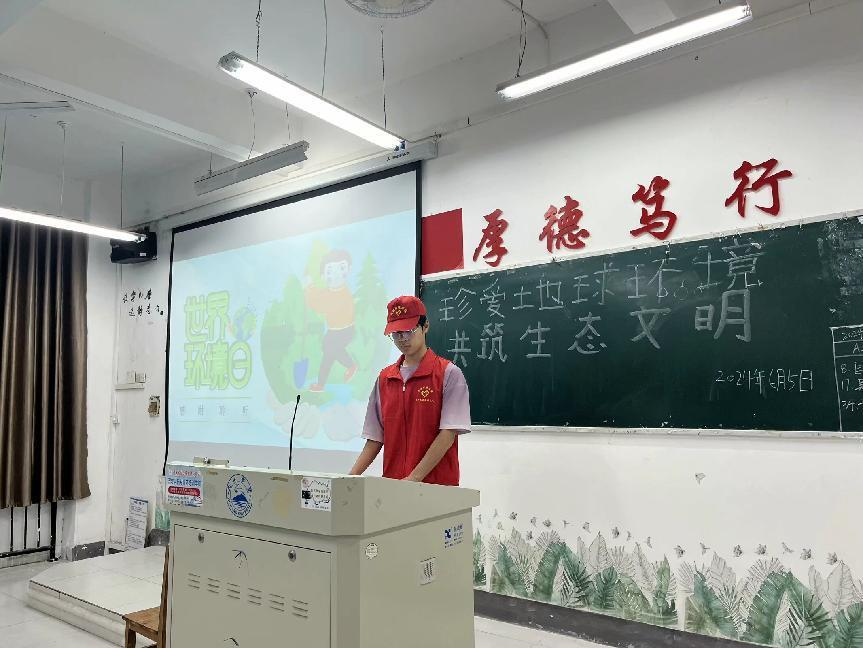 被分为三个小组的志愿者们有序到各班宣讲关于六五世界环境日的相关知识。通过使用PPT与播放习近平生态文明思想的相关视频,这些生动有趣的宣讲方式,让同学们可以将六五世界环境日的重要知识点牢记于心,并提高对环境的保护意识和对生态文明的理解。