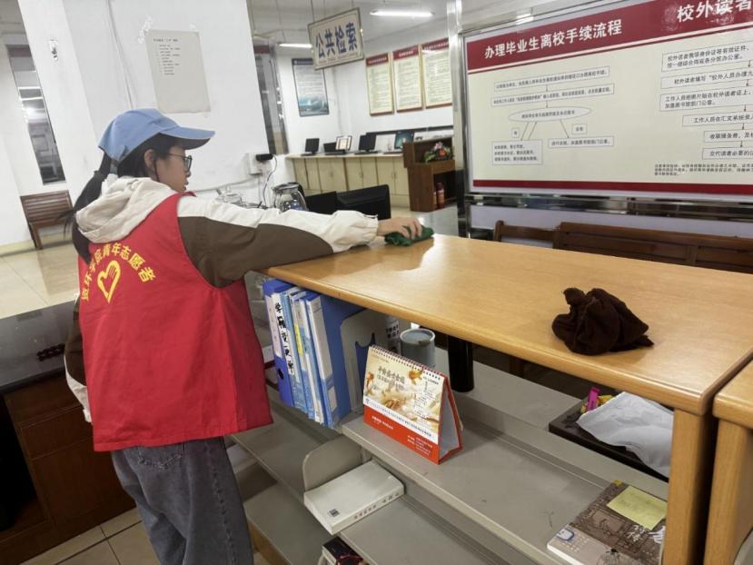 当日,志愿者们提前到达主图书馆,经过简短而明确的任务分配后,迅速投入到各自的工作岗位。有的志愿者承担起图书上架的任务,他们小心翼翼地将每一本书放置到位,确保书籍整齐有序。另一些志愿者则负责擦拭书架,他们认真负责,确保每一个书架都是一尘不染。还有志愿者在阅读区进行秩序维护,引导读者文明阅读,营造安静舒适的环境。