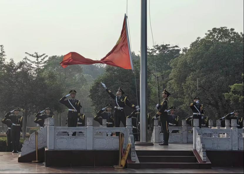 六时四十分,参加升旗仪式的同学们在升旗台前整齐列队,仪式正式开始。国旗班队员们身姿挺拔俊逸,步伐铿锵有力,护送国旗入场。“升国旗,奏唱国歌!”随着一声号令,升旗手郑重而有力地将国旗抛向天空。伴随着《义勇军进行曲》雄壮的旋律,五星红旗在晨曦中缓缓升起,全场肃然静立,深情仰望国旗,爱国情怀在每位同学心中升腾。