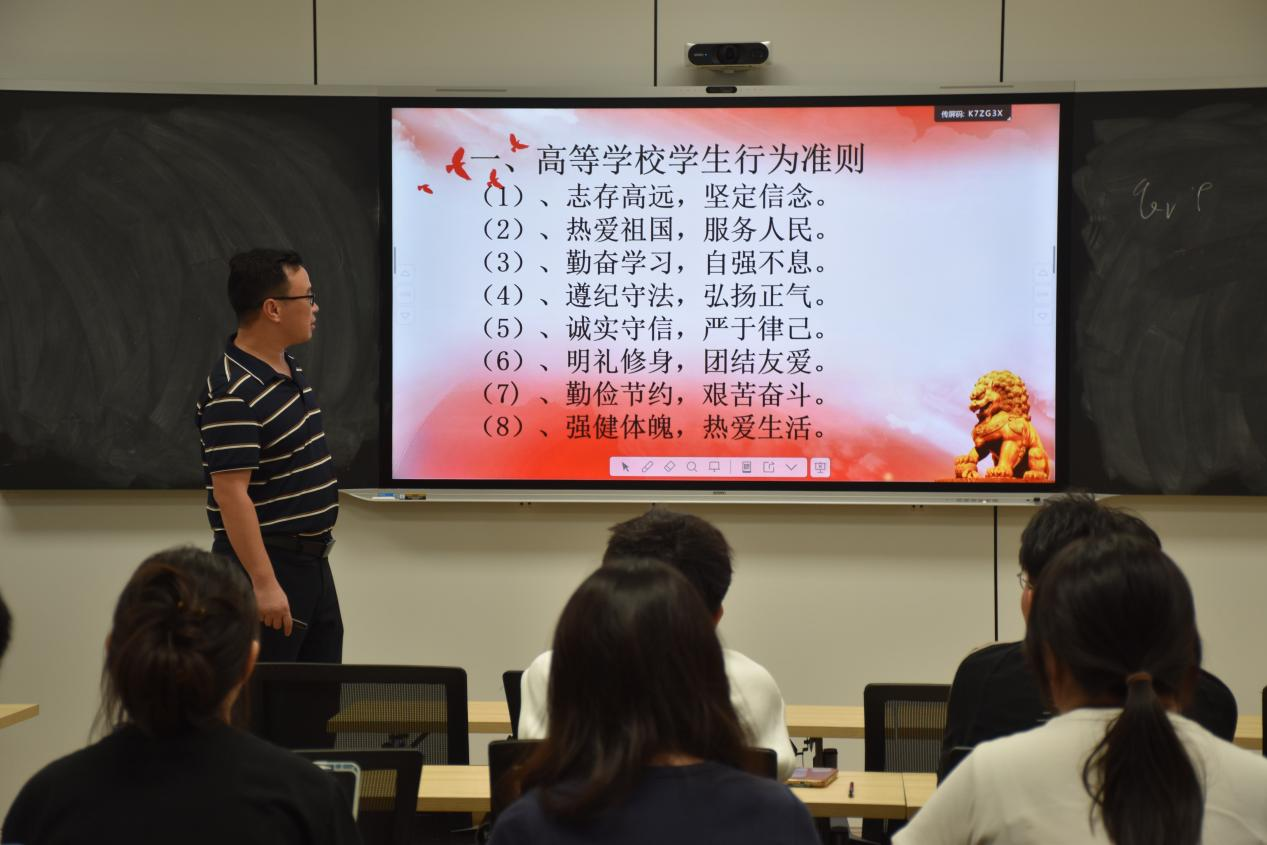为进一步强化研究生思想政治教育和廉洁自律意识,引导新生树立正确的价值观和学术道德观,9月16日晚上,学院在香远楼320举行2025级研究生“廉政教育第一课”活动。学院团委书记、学生党支部书记肖国光出席会议并为全体研究生新生作专题宣讲。