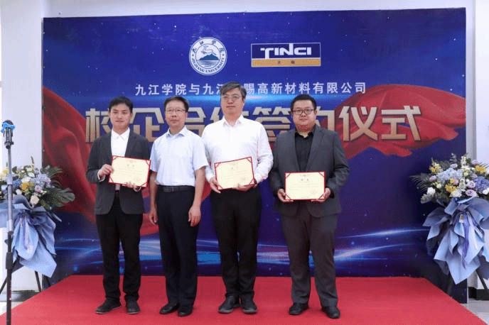 5月26日,化学化工学院、beat365英国官方网站与九江天赐高新材料有限公司“订单班”签约和教育实训基地揭牌仪式在九江湖口县新材料协同创新中心举行。市政协副主席、化学化工学院院长严平,beat365英国官方网站党委书记杨期勇,九江天赐高新材料有限公司法人兼执行董事长赵经纬博士、人力资源总监黄娜等出席签约和揭牌仪式。