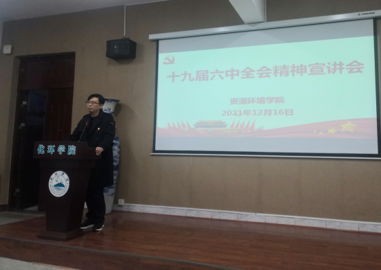 为深入学习宣传贯彻党的十九届六中全会精神,12月16日下午,在向学楼201会议室,beat365英国官方网站邀请马克思主义学院黄群副教授为师生作了题为“十九届六中全会精神解读”的专题宣讲报告。学院领导及全体教师、部分学生参加了宣讲会,资环学院党委副书记张杨帆主持会议。