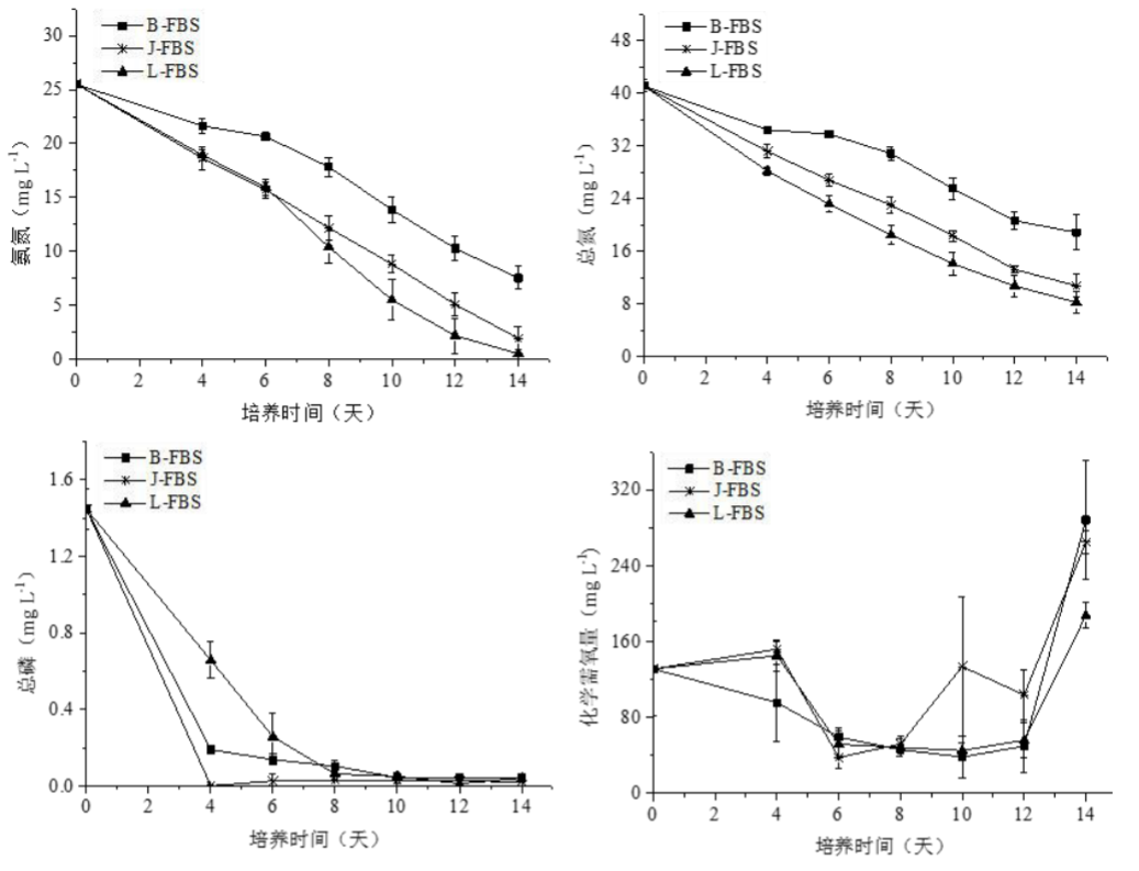 案例一:丝状蓝藻用于处理猪场沼液:微藻是一类光合效率很高的初级生产者,需要吸收氮磷等物质来维持其生长与增殖。当前,很多研究表明微藻能有效去除工业、农业和生活污水中的氮磷污染物。下图是选自华南农业大学一名硕士研究生的毕业论文,该研究选用3株丝状蓝藻用于净化10%猪场沼液中污染物,结果显示,B、J和L三株蓝藻处理14d对氨氮的去除率分别为82.33%、92.46%和97.97%;对总氮去除率分别为54.06%、73.79%和79.90%;对总磷去除率分别为97.03%、98.46%和97.14%。对于COD,处理12d时去除率分别为61.87%、20.94%和57.11%。这些结果证明蓝藻对于处理水体N、P等污染物具有较大的潜力。
